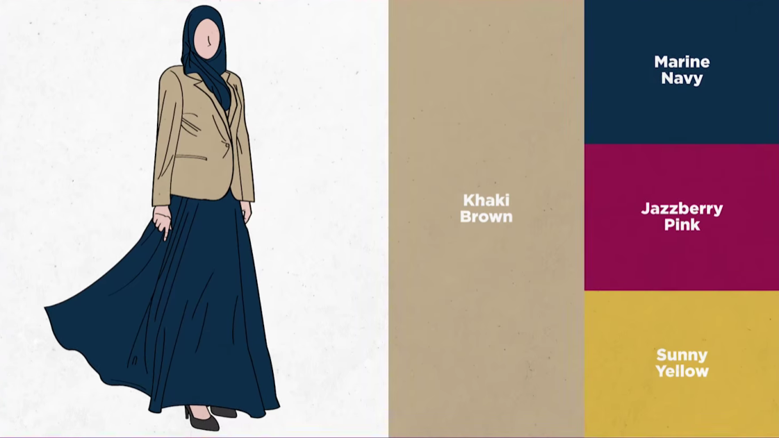 • Pemilihan warna pakaian hendaklah tidak terlalu terang atau terlalu gelap, sebaliknya digalakkan memilih warna bersifat sederhana seperti warna pastel yang lembut.